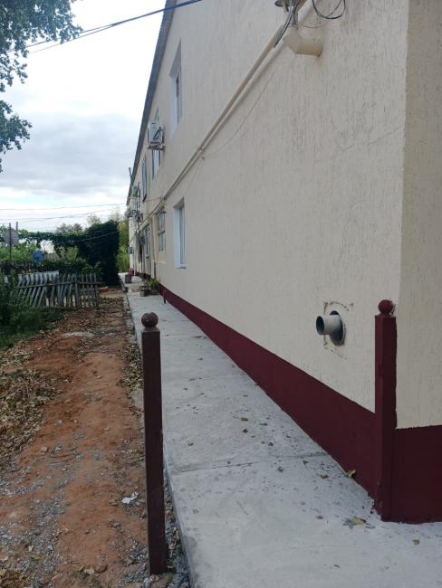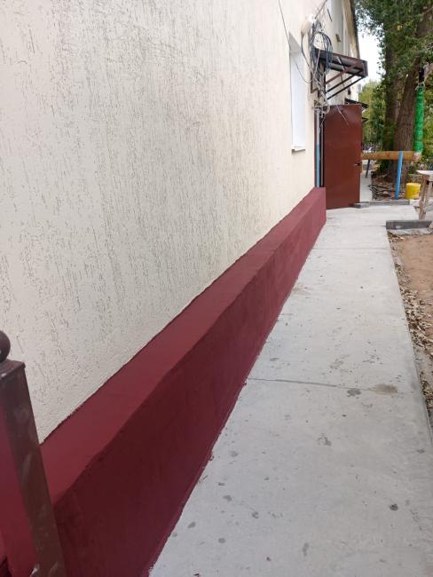 3. Ремонт фундамента. Выполнены работы по устройству наружной гидроизоляции фундамента. Произведена укладка бетонной отмостки по щебенчатой поверхности с армированием и установкой бортовых камней.